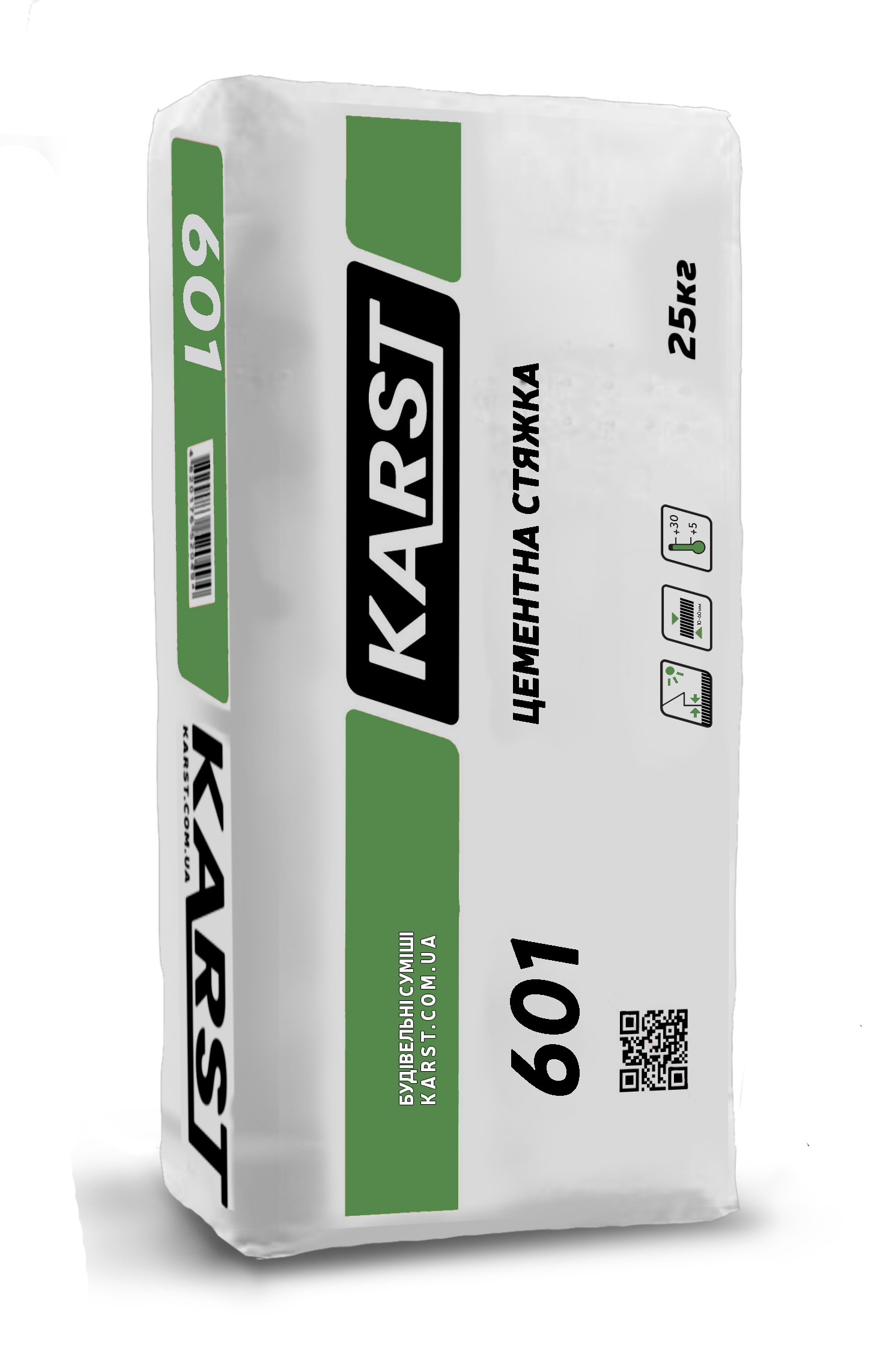 Цементна стяжка «KARST 601» призначена для укладання та ремонту підлог всередині і зовні будинків, виготовлення підлог під ухилом, підготовки основ під нівелювальні суміші, а також під укладання керамічних покриттів. Може використовуватись для укладання стяжок підлоги, з’єднаних жорстко з основою (товщина шару від 10 мм), на розділовому шарі (товщина шару від 3 мм), на «плаваючих» (теплоізоляція) шарах (товщина від 40 мм) та в системах підлог з підігрівом